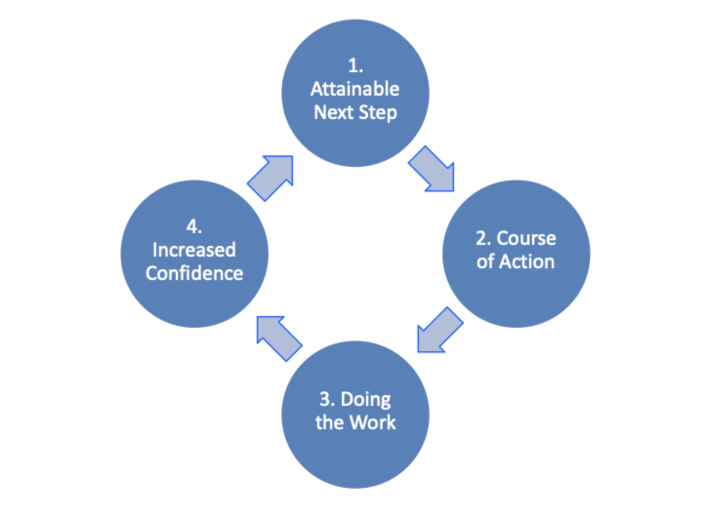 To shed our fictitious ego, we have to do things that are slightly outside our confidence level, and then take a slightly bigger step following each success. Some experts encourage us to set gigantic goals, even if we can’t obtain them, but we always achieve great things by taking a series of small steps, each building on the last, until we arrive at a place we never imagined. So first, define an attainable next step you know you can achieve. Then plan a course of action, do the work, and you will gain increased confidence following your success. Next time around set a slightly bigger goal and complete the process. This approach to change is illustrated in the figure below.